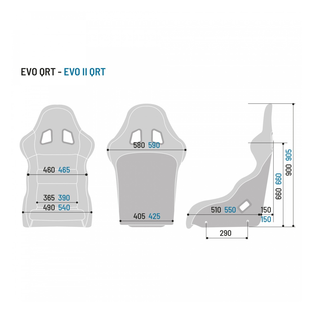 Atualizada com a nova tecnologia QRT, a Baquet EVO, disponível também no tamanho L (Evo II), tem um tecido antiderrapante nos ombros e no assento, uma nova almofada dividida em 2 partes para um conforto inigualável e novas costuras. Novo sistema de retenção de ombros (apenas para EVO) para instalação em veículos pequenos. Fixo com fixações laterais com espaçamento de 290mm.